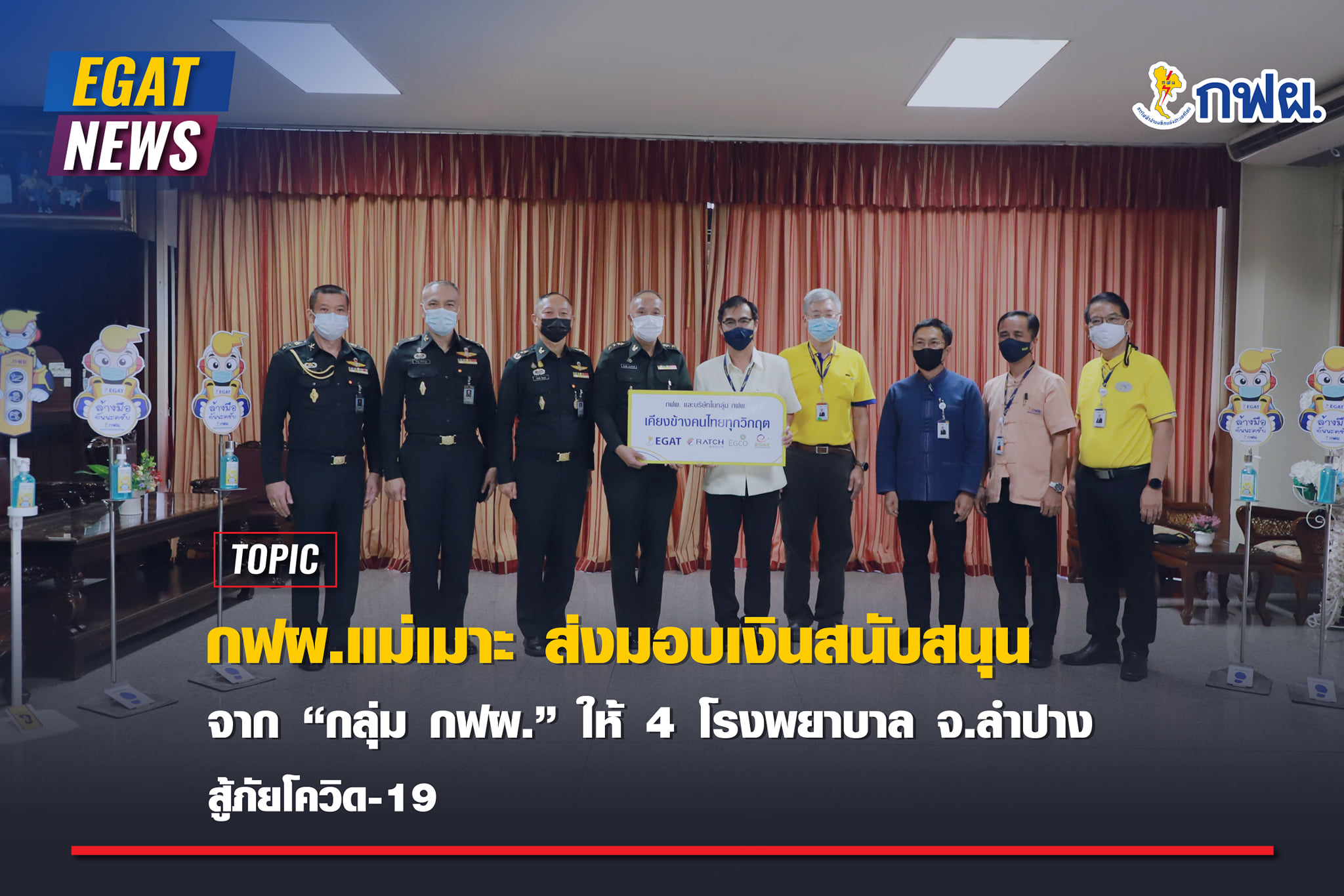 กฟผ.แม่เมาะ ส่งมอบเงินสนับสนุนจาก “กลุ่ม กฟผ.” ให้ 4 โรงพยาบาล จ.ลำปาง สู้ภัยโควิด-19